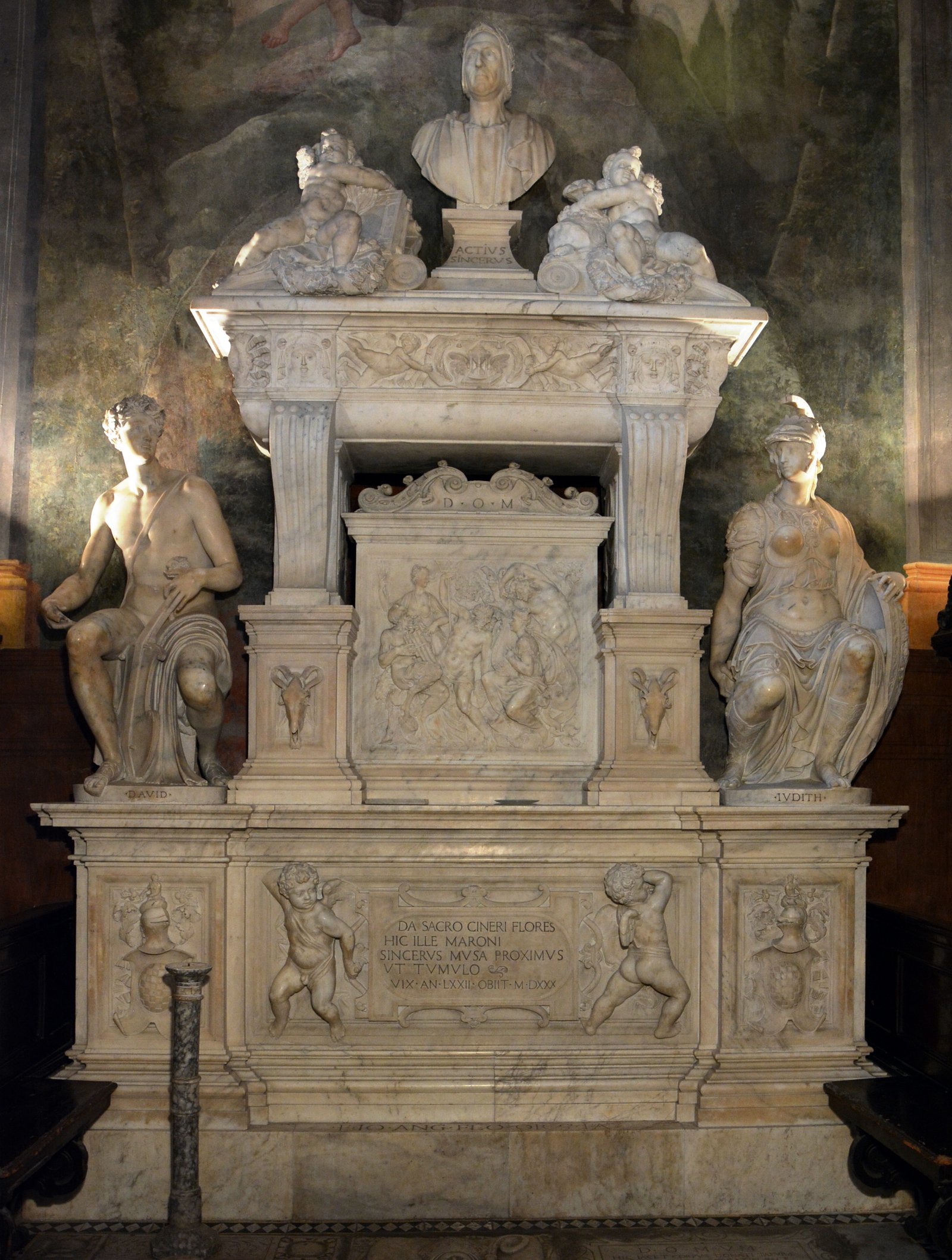 В последний период своей жизни он посвятил себя в основном латинскому производству: «Эпиграмматам», «Свободным элегиям», состоящим из 24 элегий, разделенных на три части, и « Эклогам рыбаков», где пасторальный мир переносится в морское измерение Неаполитанского залива [обо всем этом есть, а также о следующей работе про Марию — обзор на нашем сайте]. В этот период активизировалась его сеть связей с итальянскими интеллектуалами, о чем свидетельствуют, например, эпистолярные отношения с Пьетро Бембо, в стихах которого находят сходства со стихами Саннадзаро. В 1526 году была опубликована поэма «De partu Virginis» («Рождение Девы») на латинском языке, написанная гекзаметрами, о материнстве Марии, обнаруживающая (в стиле и языке) влияние Вергилия. Несмотря на небольшой размер поэмы (около 1500 стихов), Саннадзаро работал над ней более 20 лет. Поэма вызвала бурные споры современников (включая Эразма Роттердамского), но, наряду с современной поэмой Марко Джироламо Виды «Христиада» [см. обзор на нашем сайте], стала одним из первых образцов крупного эпоса эпохи Возрождения. Ныне «Рождение Девы» оценивается как образец духовно-религиозной лирики Ренессанса и выдающийся памятник латинской поэзии как таковой в целом. Последние годы жизни Саннадзаро провел в Неаполе, где умер в 1530 году, в доме своей подруги Кассандры Маркезе. Поэт похоронен в церкви Санта-Мария-дель-Парто, названной в честь его последнего произведения; церковь была построена по его инициативе и передана в дар ордену Служителей Марии. Надгробный памятник выполнил Джованни-Анджело Монторсоли.