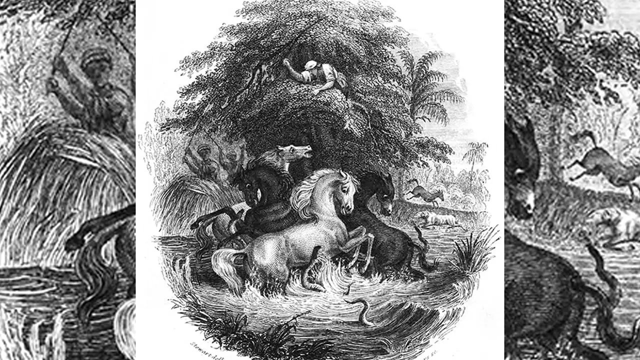 Индейцы устроили нечто вроде загона; рыбы были окружены со всех сторон и загнаны в болото. Захватывающее это зрелище, развернувшееся на наших глазах, — бой электрических угрей с лошадьми — трудно описать. Индейцы, вооружившись длинными бамбуковыми палками и гарпунами, обступили болото. Некоторые из них вскарабкались на деревья, склонившиеся над водой. Крича и размахивая палками, они загоняли лошадей подальше в воду. Напуганные шумом угри оборонялись, нанося электрические удары. Долгое время казалось, что, очевидно, они выйдут победителями из этой смертельной схватки. Лошади, оглушаемые мощью частых ударов, исчезали под водой; некоторые приходили в себя и с трудом добирались до берега, не обращая внимания на противодействие индейцев, где, обессилев, почти парализованные, растягивались на земле во всю длину.