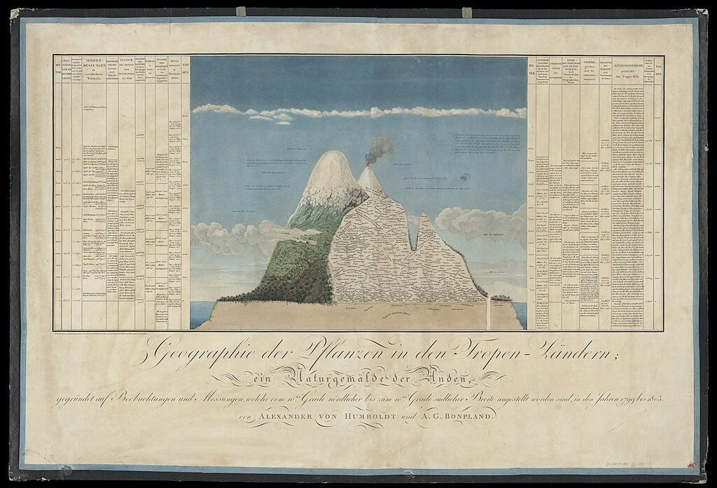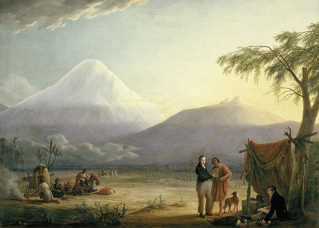 30 марта 1801 года в Картахене, на карибском побережье Колумбии, начался второй этап экспедиции. Продолжительное время было посвящено исследованию плато Сабана-де-Богота. Первым делом они направились в столицу нынешней 🇨🇴 Колумбии (Богота), и поскольку Бонплан заболел, они пробыли здесь до 9 сентября. Благо, здесь жил интересный им испанский ботаник Хосе Селестино Мутис (который даже находился в переписке с Линнеем, и был незаурядным ученым), и им было что обсудить и посмотреть, ведь у Мутиса была собственная коллекция растений. Дальнейший маршрут пролегал через проход Квиндиу (Кордильеры) в Кито (столица современного Эквадора). Это был утомительный и опасный переход: пешком, по узким ущельям, под проливным дождём, без обуви, которая быстро износилась и развалилась. Как бы то ни было, в январе 1802 года путешественники достигли Кито. В этой части Америки они оставались около года, изучая со всевозможных точек зрения её богатую природу. Гумбольдт поднимался на вулканы Пичинчу, Котопахи, Антизану, Тунгурауа, пытался взойти на до тех пор никем не покорённый Чимборасо (путь преградила расщелина, оценки высоты, до которой поднялся Гумбольдт, варьируют от 5350 до 5878 м) и другие. Хотя на вершину он взобраться не смог, наткнувшись на непреодолимое препятствие и высотную болезнь, это оставалось мировым рекордом высоты для альпинистов в течение 30 лет.