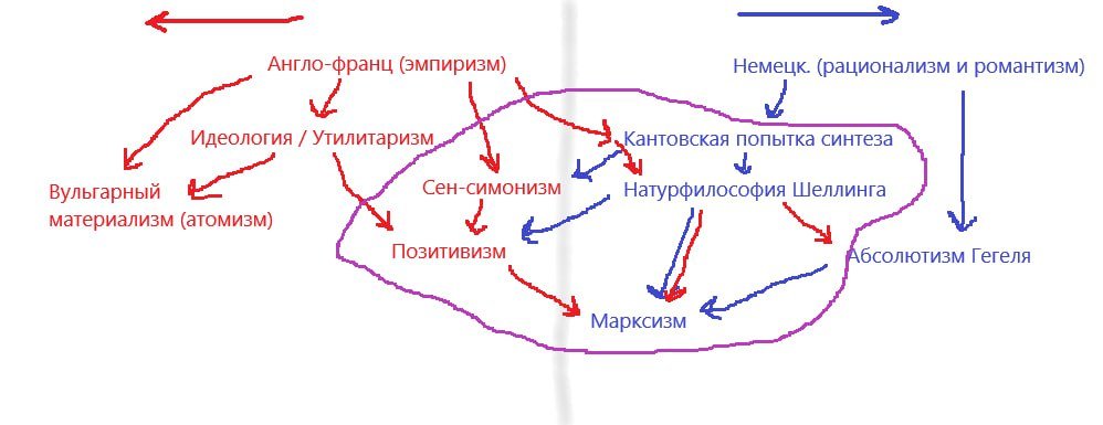 Вот в пейнте на коленке сделал примитивную схемку. Две основные традиции и направления (эмпиризм и рационализм) казались слишком разными, чтобы их можно было объединить. Большинство философских направлений решили, что объединить их таки нужно, но на каких основаниях? За исключением идеологов, утилитаристов и атомистов (которые почти не затронуты проблемой синтеза, а просто развивали эмпиризм, насколько могли в «чистом» виде), и в каком-то смысле Гегеля (который эмпиризм презирал, а свою эмпиричность черпал уже из идеалистической «натурфилософии») все остальные (выделенные в фиолетовую зону) занимались синтезом, неизбежно «склоняясь» к первой или второй стороне в своем итоговом «целом». Если Кант еще выделяется как агностик/скептик, то все остальные (Сен-Симон, Позитивизм, Натурфилософия и Марксизм) находятся так близко друг к другу, что иногда разница между ними стирается. Я бы пока назвал их «синтетическими учениями», или «духом времени» для XIX века.